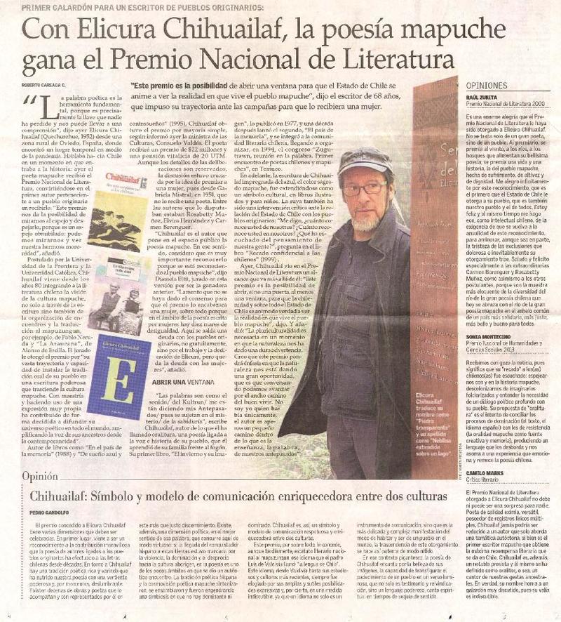 Con Elicura Chihuailaf, la poesía mapuche gana el Premio Nacional de Literatura [artículo] Roberto Careaga C.