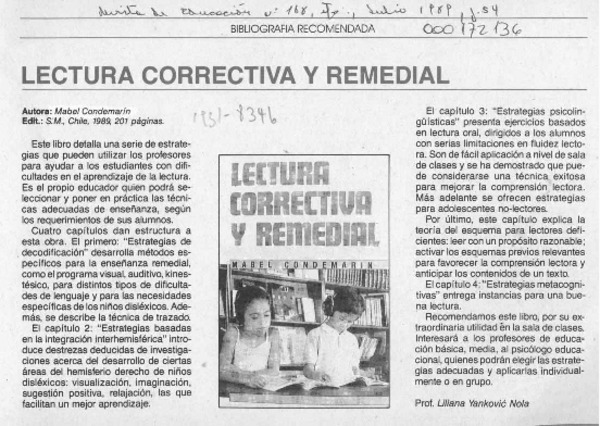 Lectura correctiva y remedial [artículo] Liliana Yanković Nola.