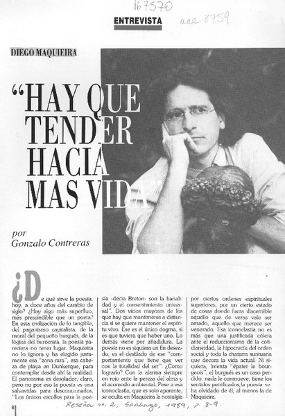 Diego Maquieira, "Hay que tender hacia más vida" [artículo] Gonzalo Contreras.