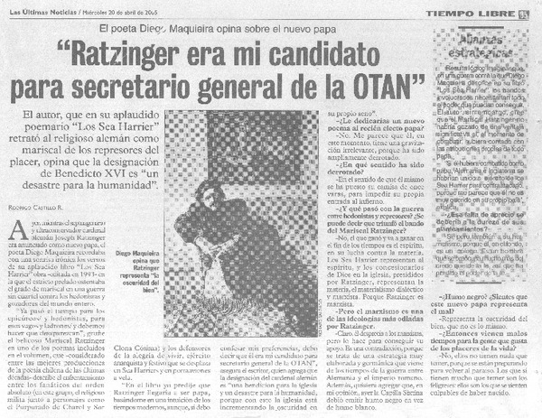 "Ratzinger era mi candidato para secretario general de la OTAN" (entrevistas) [artículo]Rodrigo Castillo R.