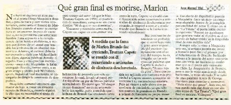 Qué gran final es morirse, Marlon [artículo] Juan Manuel Vial.