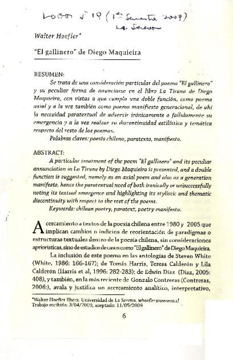 "El gallinero" de Diego Maquieira [artículo] Walter Hoefler.