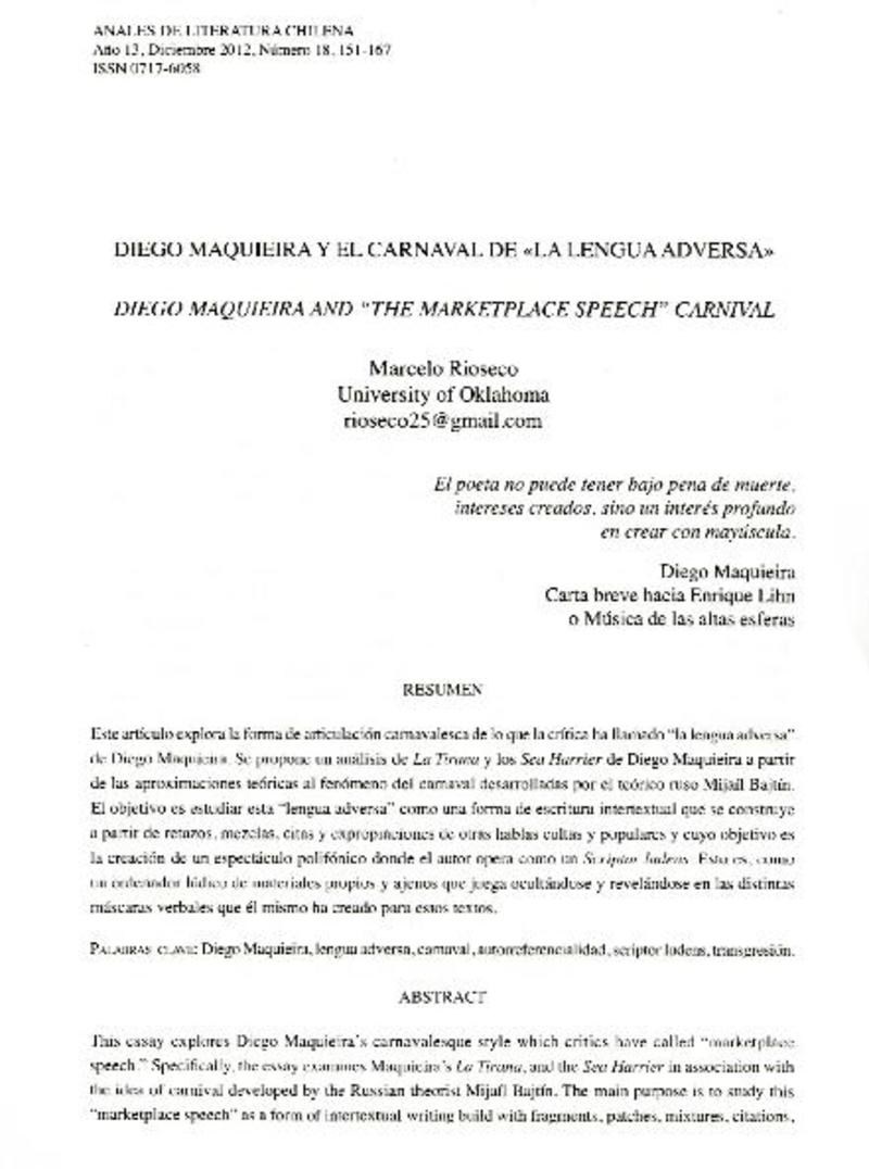 Diego Maquieira y el carnaval de "La lengua adversa" [artículo] Marcelo Rioseco