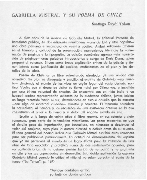 Gabriela Mistral y su Poema de Chile [artículo] Santiago Daydí Tolson.