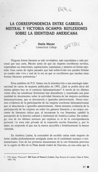 La correspondencia entre Gabriela Mistral y Victoria Ocampo, reflexiones sobre la identidad americana [artículo] Doris Meyer.