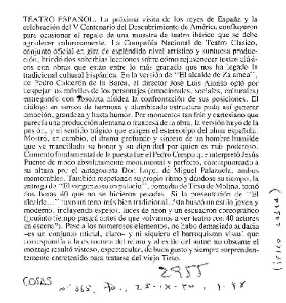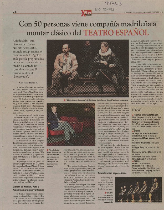 Con 50 personas viene compañía madrileña a montar clásico del teatro español [artículo] Ana Rosa Romo R.