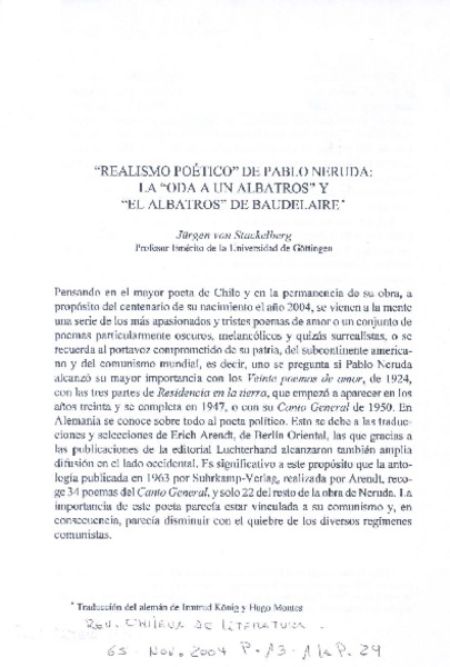"Realismo poético" de Pablo Neruda : la "oda a un albatros" ; y, "el Albastros" de Baudelaire [artículo] Jürgen von Stackelberg.