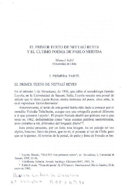 El primer texto de Neftalí Reyes y el último poema de Pablo Neruda [artículo] Manuel Jofré.