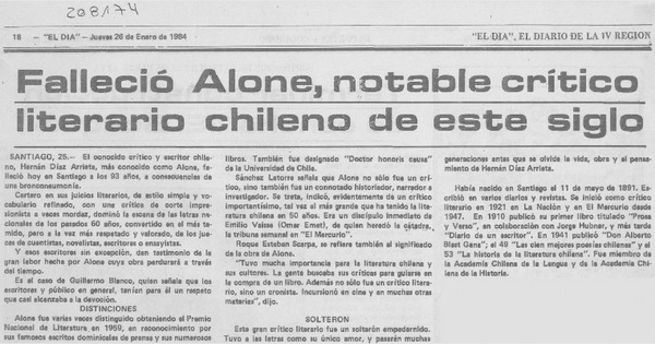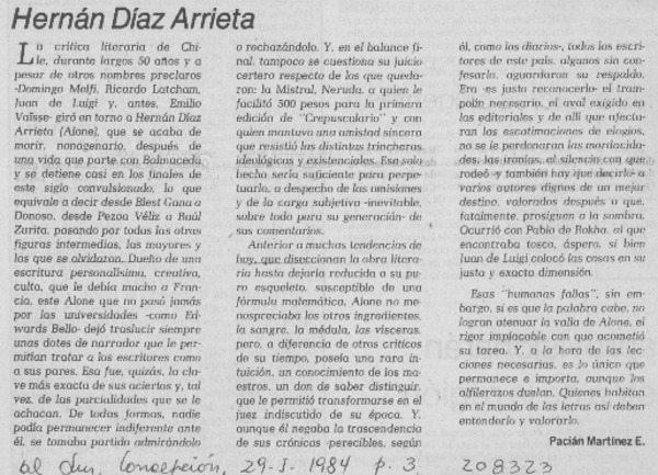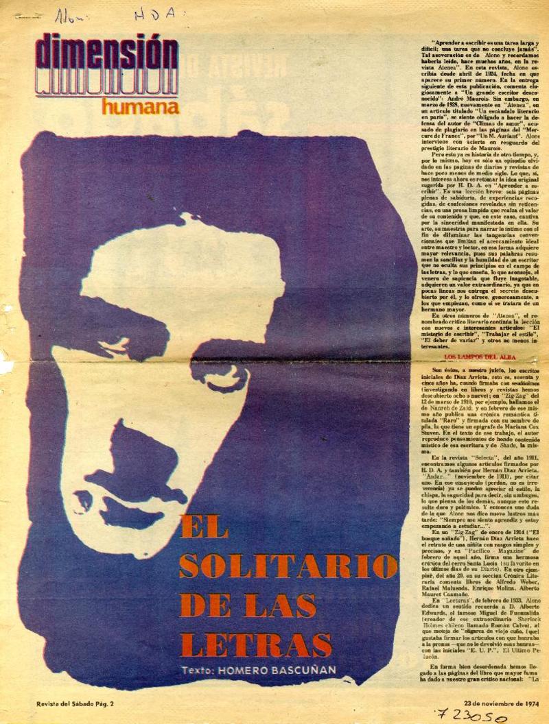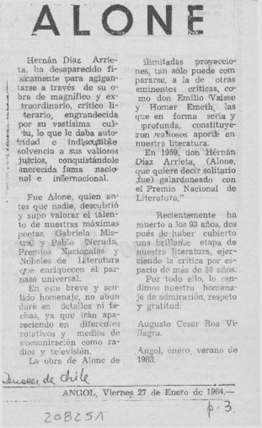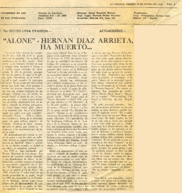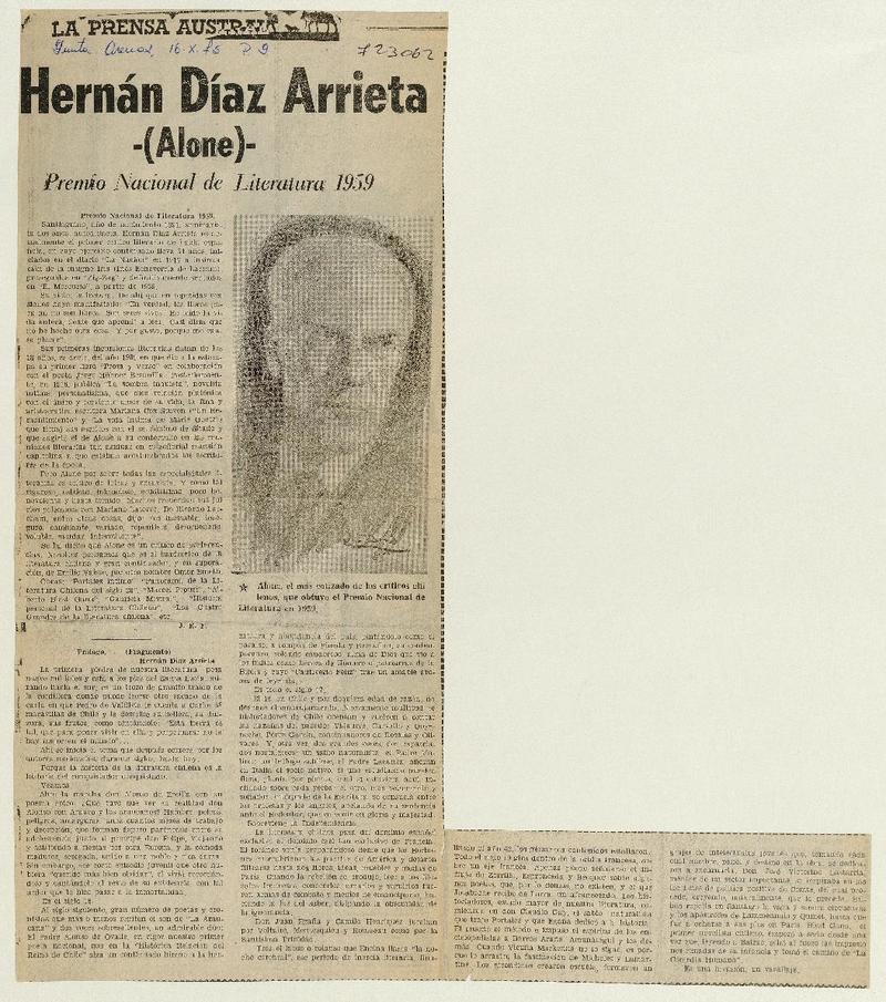 "Alone", Hernán Díaz Arrieta, ha muerto [artículo] Héctor Leiva Oyarzún.