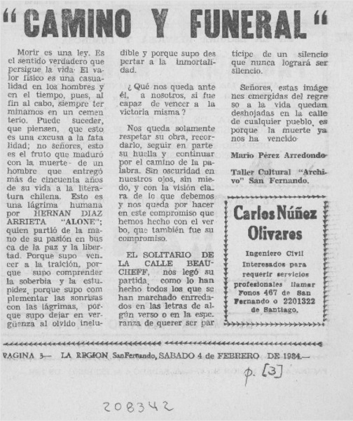 "Camino y funeral" [artículo] Mario Pérez Arredondo.