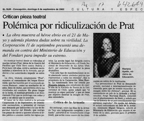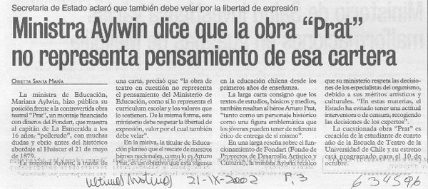 Ministra Aylwin dice que la obra Prat no representa pensamiento de esa cartera [artículo] Orietta Santa María