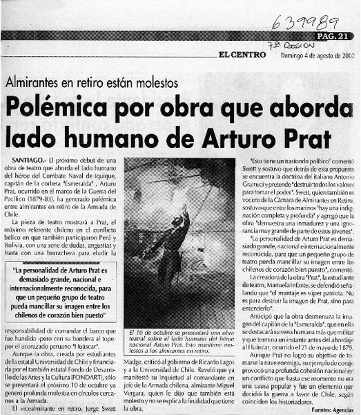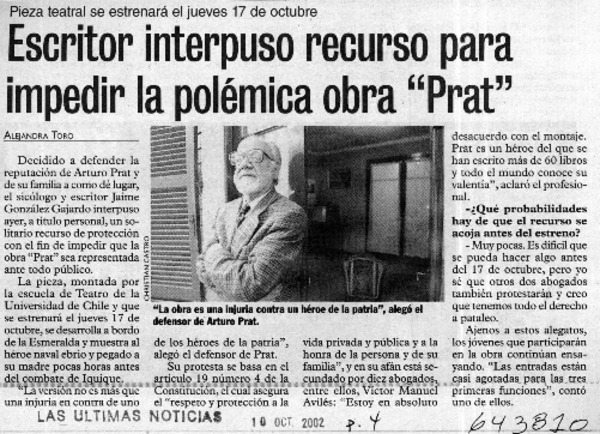Escritor interpuso recurso para impedir la polémica obra "Prat" [artículo] Alejandra Toro