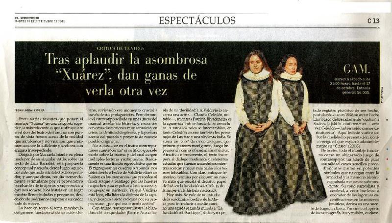 Tras aplaudir la asombrosa "Xuárez", dan ganas de verla otra vez [artículo] Pedro Labra Herrera.
