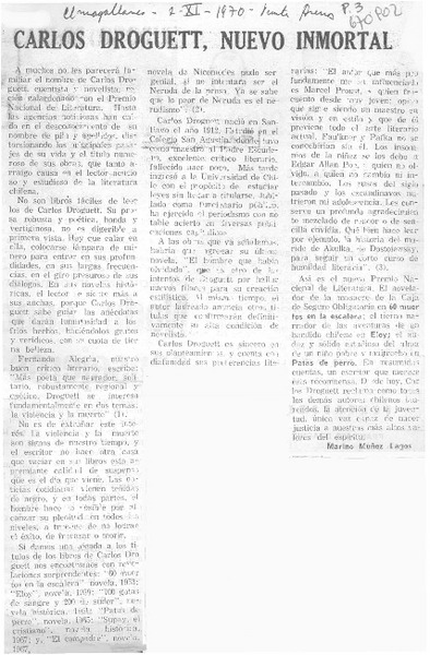 Carlos Droguett, nuevo inmortal [artículo] Marino Muños Lagos.
