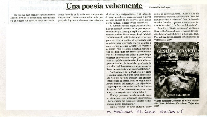 Una poesía vehemente [artículo] Marino Muñoz Lagos.
