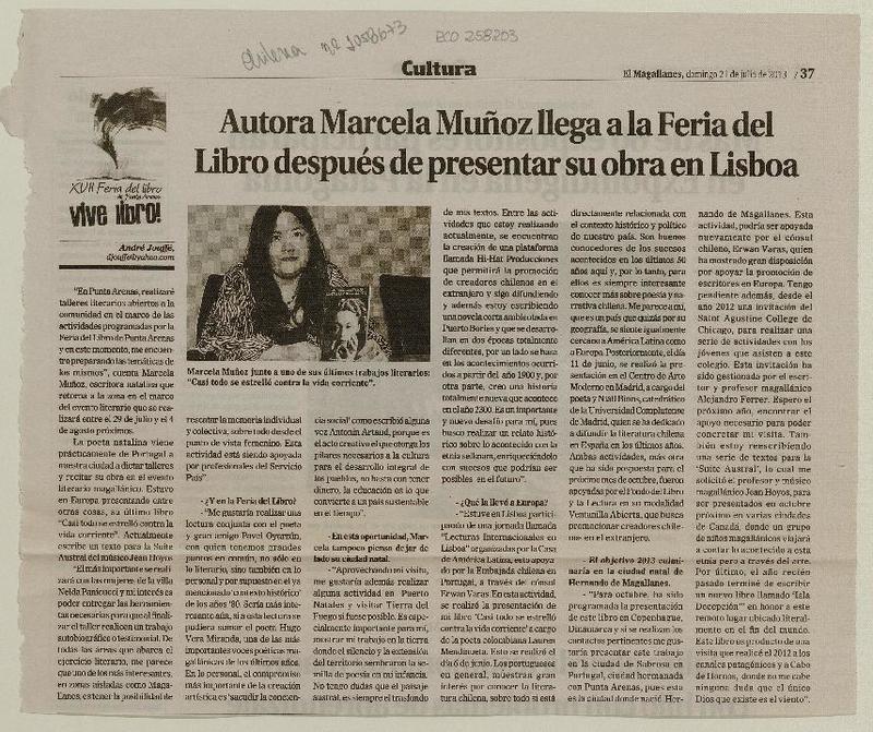 Autora Marcela Muñoz llega a la feria del libro después de presentar su obra en Lisboa (entrevista) [artículo] André Jouffé.