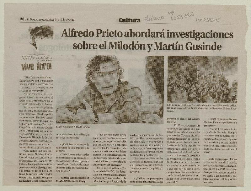 Alfredo Prieto abordará investigaciones sobre el Milodón y Martín Gusinde (entrevista). [artículo]