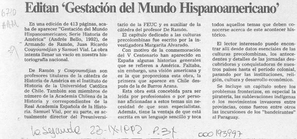 Editan "Gestación del mundo hispanoamericano" [artículo].