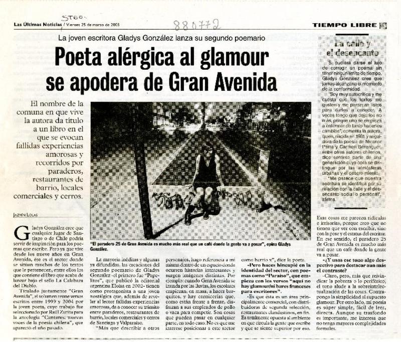 La joven escritora Gladys González lanza su segundo poemario : poeta alérgica al glamour se apodera de Gran Avenida [artículo] Jazmín Lolas.