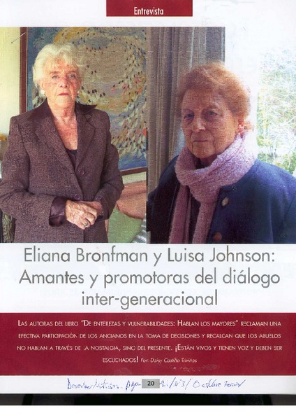 Eliana Bronfman y Luisa Johnson: Amantes y promotoras del diálogo inter-generacional [artículo] Daisy Castillo Triviños.