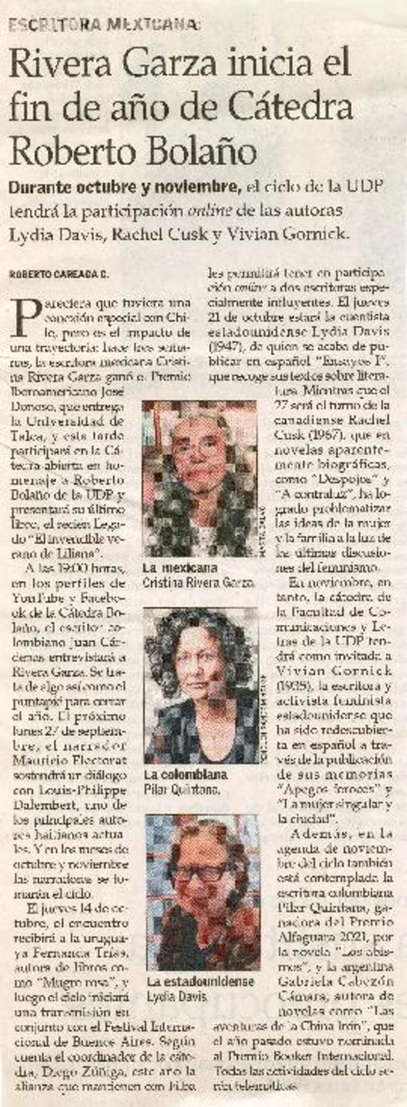 Autores chilenos - Bolaño, Roberto - Autoras colombianas - Autoras mexicanas - Autoras estadounidenses - Quintana, Pilar - Autoras britanicas - David, Lydia - Cusk, Rachel - Gornik, Vivian - Rivera Garza, Cristina