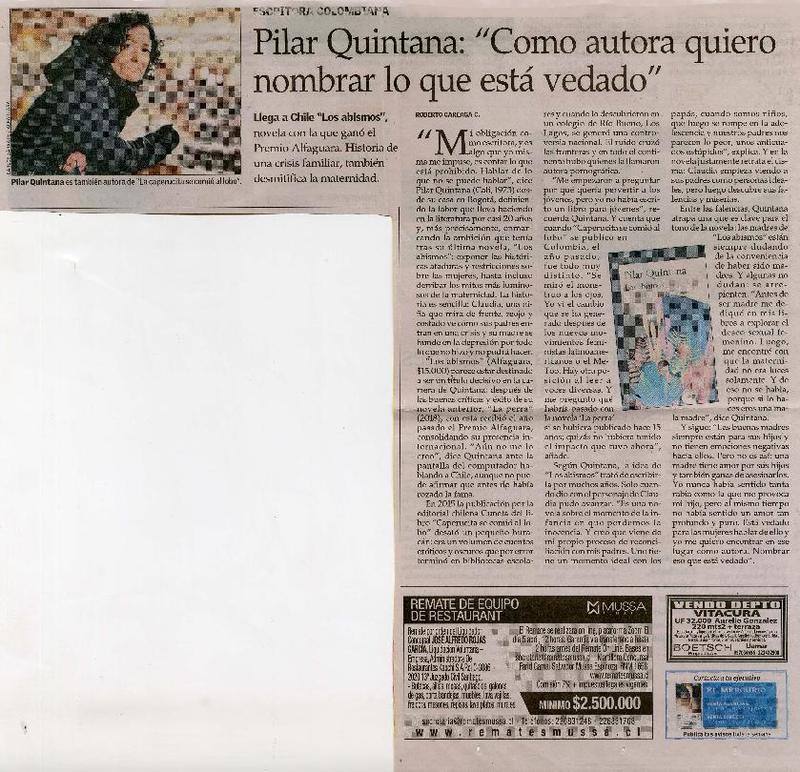 Pilar Quintana : "Como autora quiero nombrar lo que está vedado" [artículo] Roberto Careaga C.