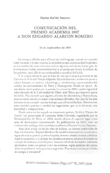 Comunicación del Premio Academia 2007 a Don Edgardo Alarcón Romero [artículo] Matías Rafide.