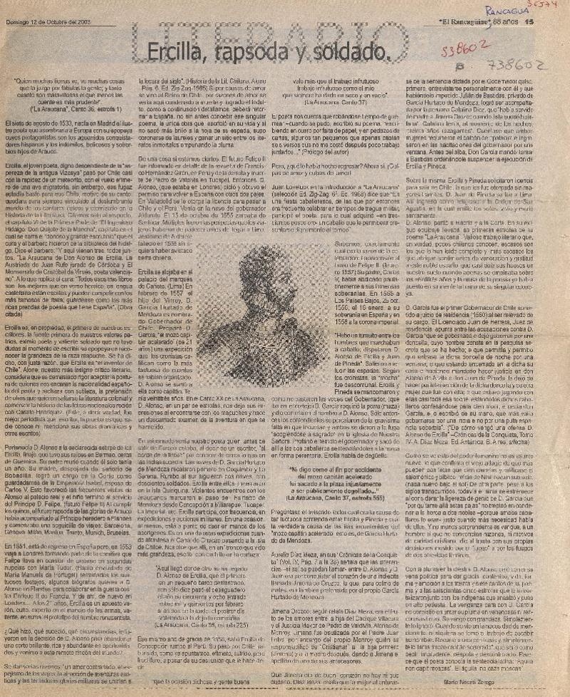 "Alonso de Ercilla asumió los costos como Luther King y el "Che" Guevara" [artículo] Javier García.
