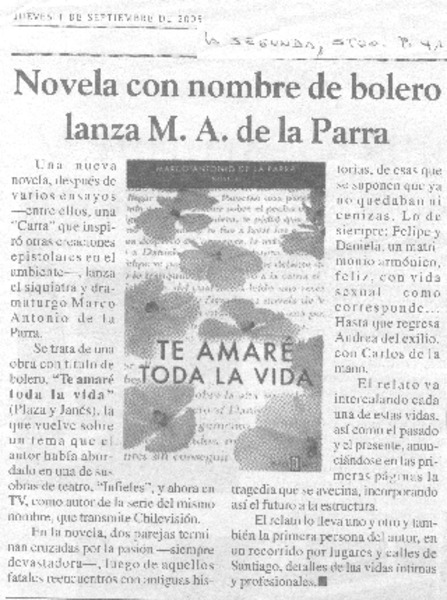 Novela con nombre de bolero lanza M. A. de la Parra. [artículo]