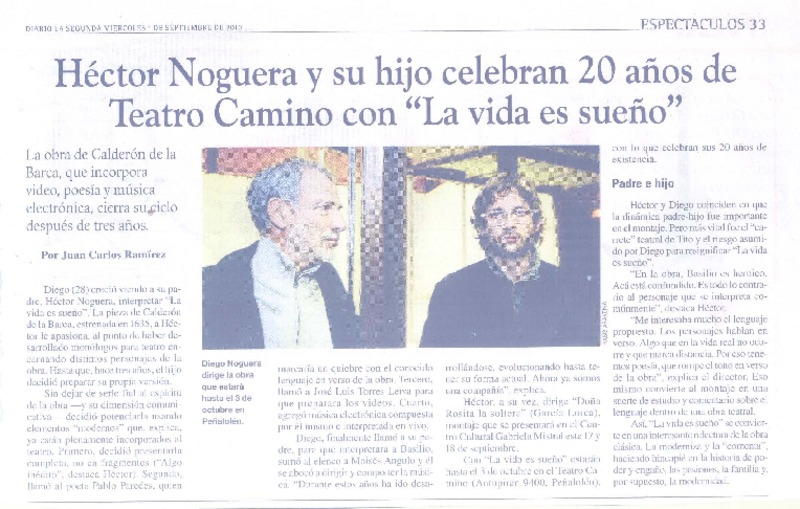 Héctor Noguera y su hijo celebran 20 años de Teatro Camino con "La vida es sueño" [artículo] Juan Carlos Ramírez.