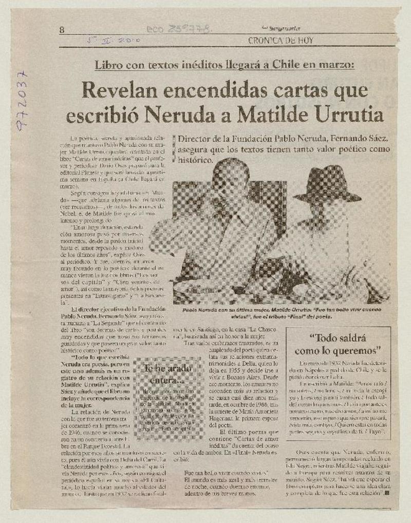 Revelan encendidas cartas que escribió Neruda a Matilde Urrutia [artículo].