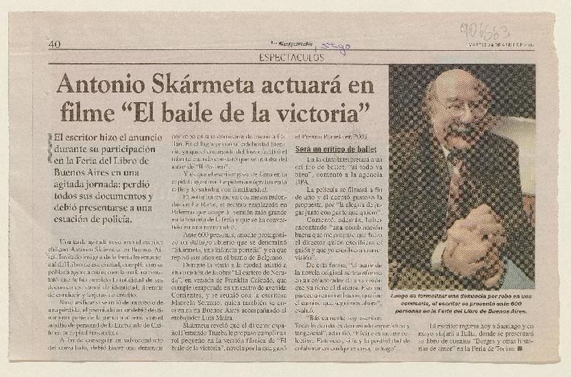 Antonio Skármeta actuará en filme "El baile de la victoria" [artículo].
