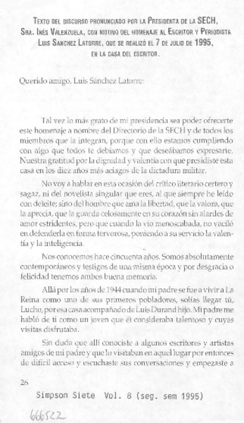 Texto del discurso pronunciado por la Presidenta de la SECH... [artículo] Inés Valenzuela.