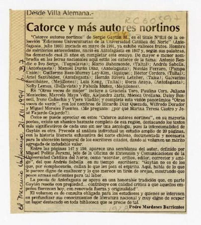 Catorce y más autores nortinos [artículo] Pedro Mardones Barrientos.