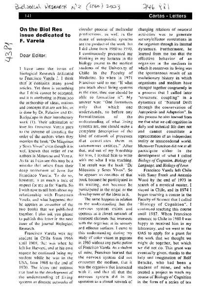 On the Biol. Res. issue dedicated to F. Varela [artículo] Humberto Maturana Romesín.