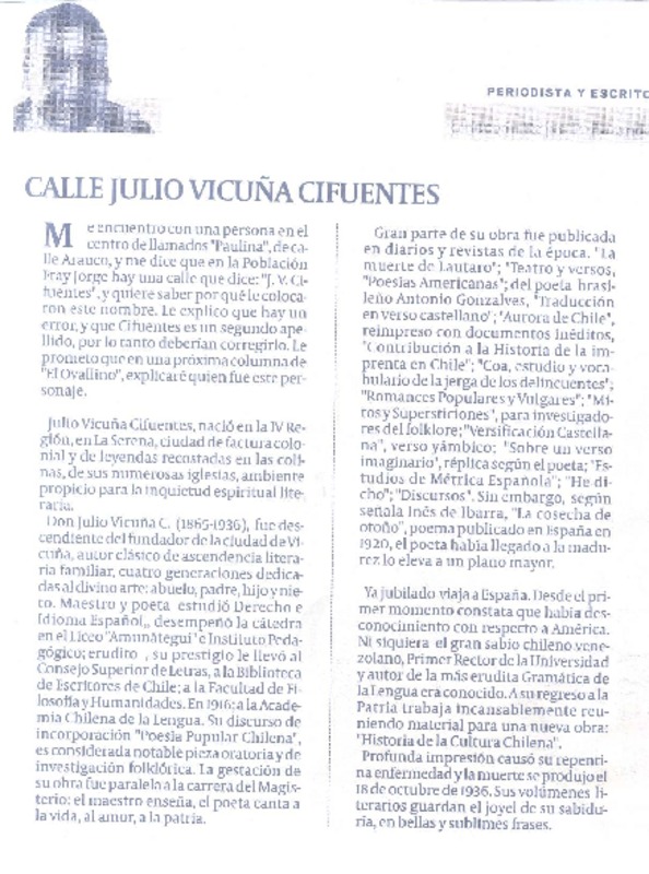 Calle Julio Vicuña Cifuentes [artículo] Lincoyán Rojas Peñaranda.