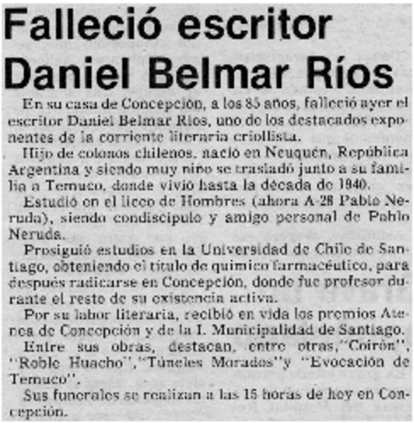 Falleció escritor Daniel Belmar Ríos [artículo].