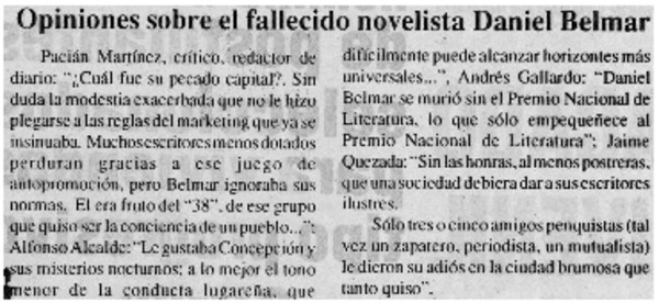 Opiniones sobre el fallecido novelista Daniel Belmar [artículo].