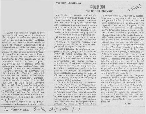 Lecturas de "Coirón", ensayo y música en homenaje a D. Belmar. [artículo]