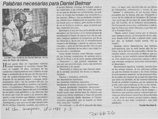 Palabras necesarias para Daniel Belmar [artículo] Pacián Martínez E.