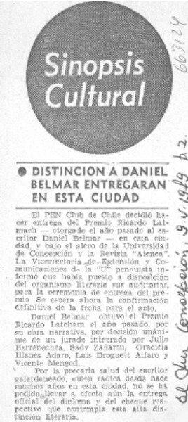 Distinción a Daniel Belmar entregarán en esta ciudad. [artículo]