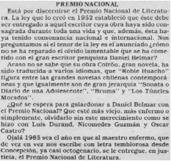 Piden Premio Nacional para Daniel Belmar. [artículo]