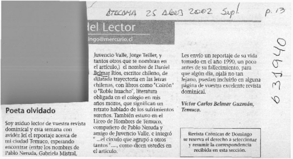 Poeta olvidado [artículo] Víctor Carlos Belmar Guzmán