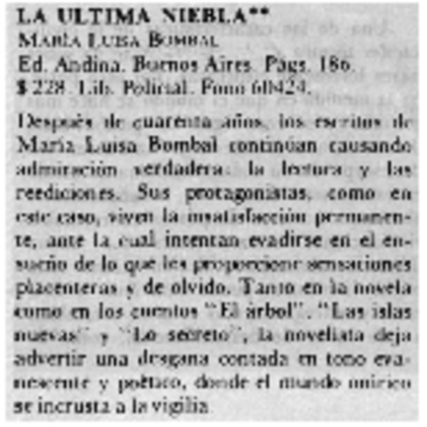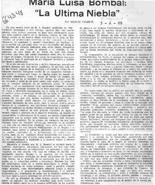 María Luisa Bombal, "La Ultima Niebla" [artículo] Ignacio Valente.