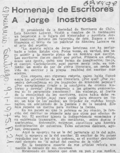 Homenaje de escritores a Jorge Inostrosa. [artículo]