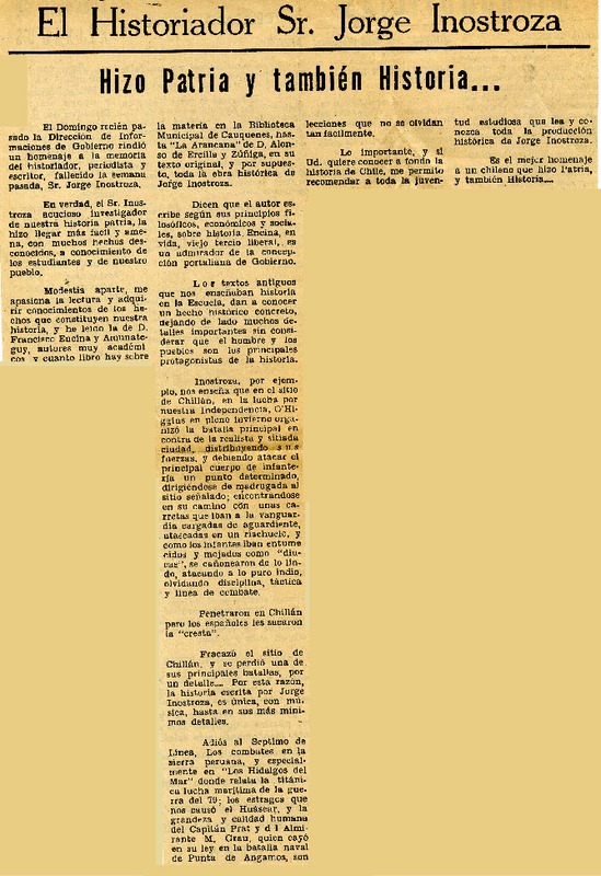 El historiador Sr. Jorge Inostrosa hizo patria y también historia. [artículo]