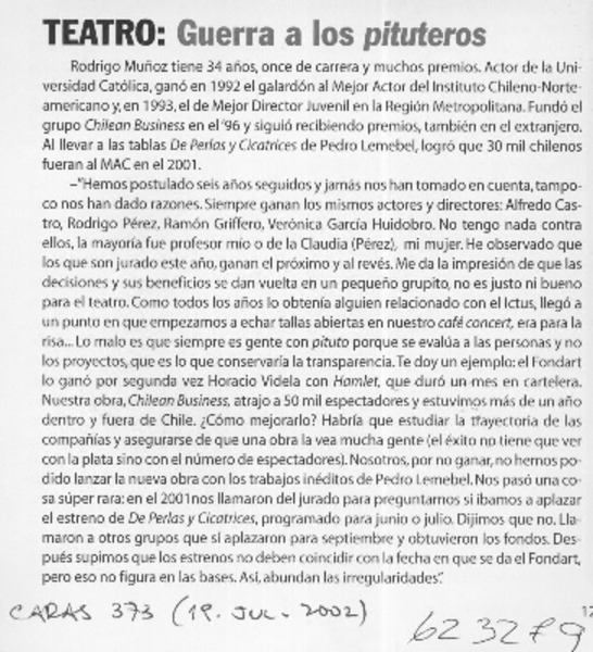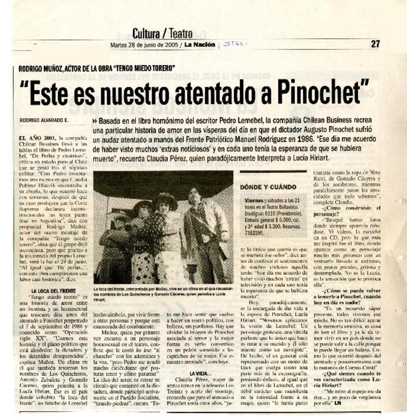 Rodrigo Muñoz, actor de la obra "Tengo miedo torero" : "este es nuestro atentado a Pinochet" [artículo] Rodrigo Alvarado E.