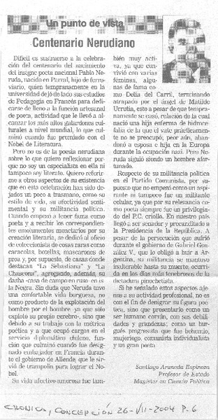 Centenario nerudiano. [artículo] Santiago Araneda Espinoza