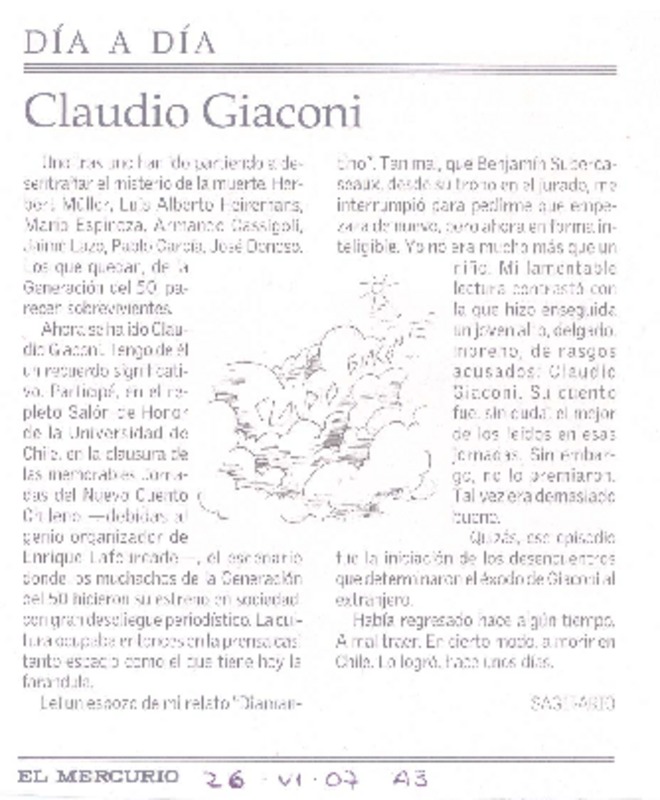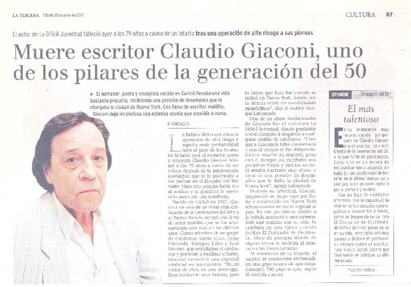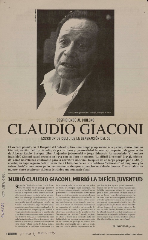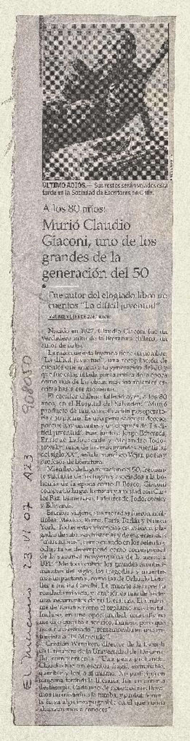 Muere escritor Claudio Giaconi, uno de los pilares de la generacion del 50 [artículo]R. González M.