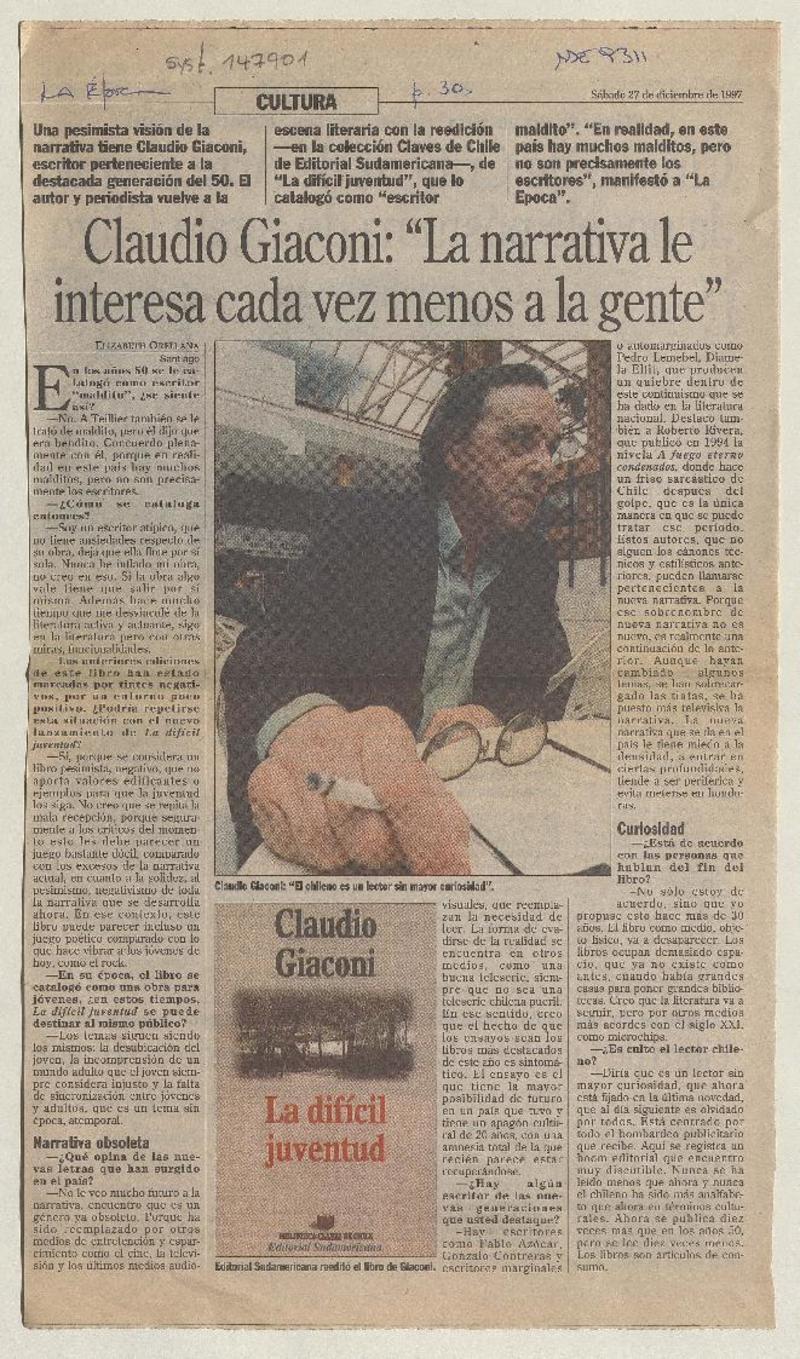Claudio Giaconi : "La narrativa le interesa cada vez menos a la gente" [entrevista] [artículo] : Elizabeth Orellana.